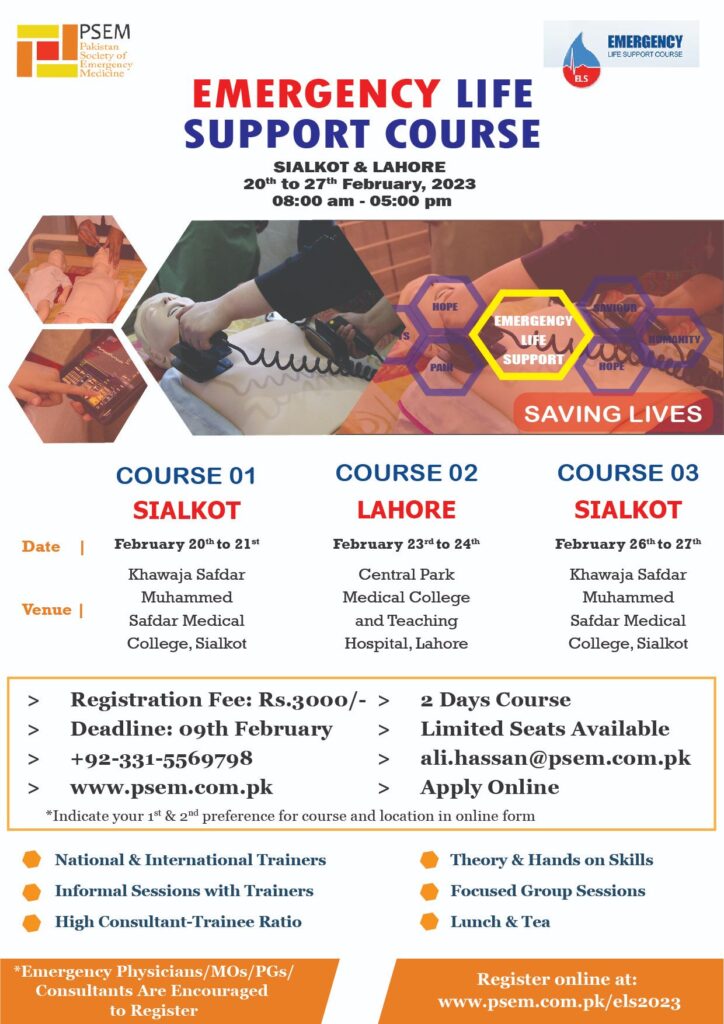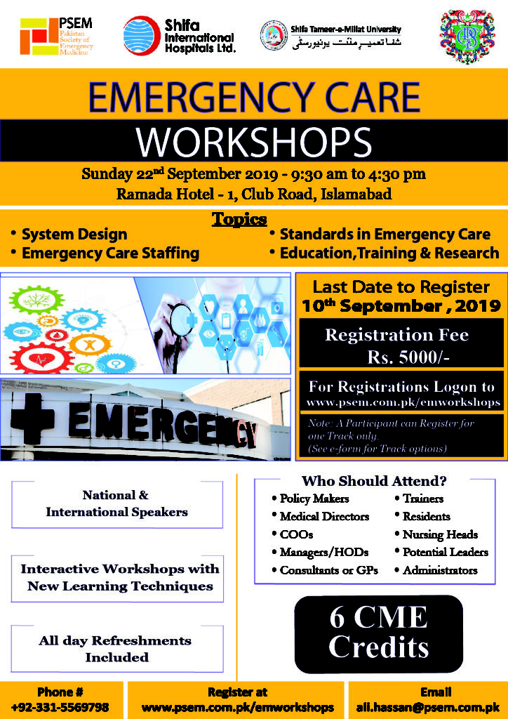 Emergency Medicine summit will be held on 23 September 2019. It will be a showcase of all important national and International stakeholders and is held with the collaboration between CPSP (College of Physicians and Surgeons Pakistan), RCEM (Royal College of Emergency Medicine) and PSEM ( Pakistan Society of Emergency Medicine).